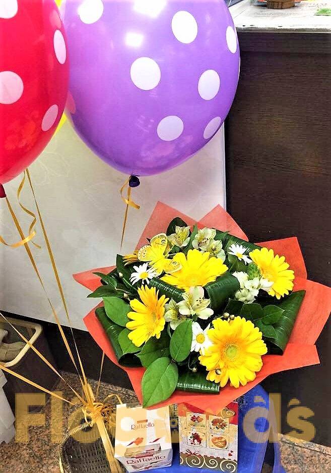 Букет из гербер, ромашек и альстромерий – это уникальное сочетание. Дополненный зеленью набор подарит ощущение счастья. Праздничный, радующий глаз и согревающий сердце подарок для любого повода. Лучший выбор для презента близким и родным людям.
